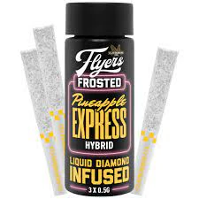 Claybourne Frosted Flyers Infused Pineapple Express Pre-rolls are THCA diamond frosted, terpene enhanced with natural flavouring agents and infused with liquid diamonds. These three hybrid pre-rolls boast 40-50% THC. Looking for bold flavour and a potent experience? Look no further than Claybourne Frosted Flyers.