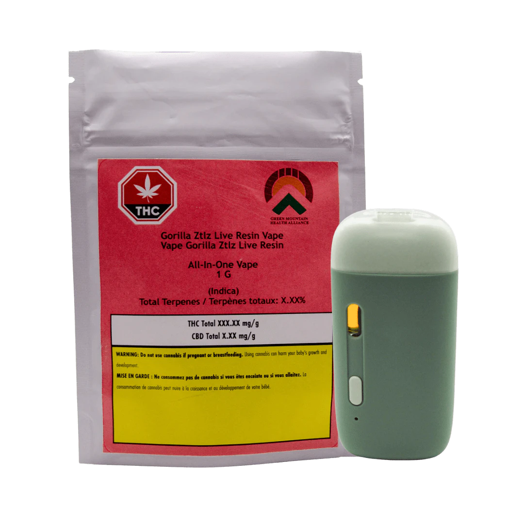 Experience bold flavour and full-spectrum potency with Gorilla Ztlz Live Resin All-in-One. Crafted from fresh-frozen flower and propane-extracted for high (8-12%) terpene richness, this 1g device delivers tropical fruit, berry, and diesel notes in every smooth pull. Cold-finish cultivation enhances aroma and depth. All in a sleek, pre-charged, draw-activated pod. No fillers, no fuss—just pure, portable vapour.