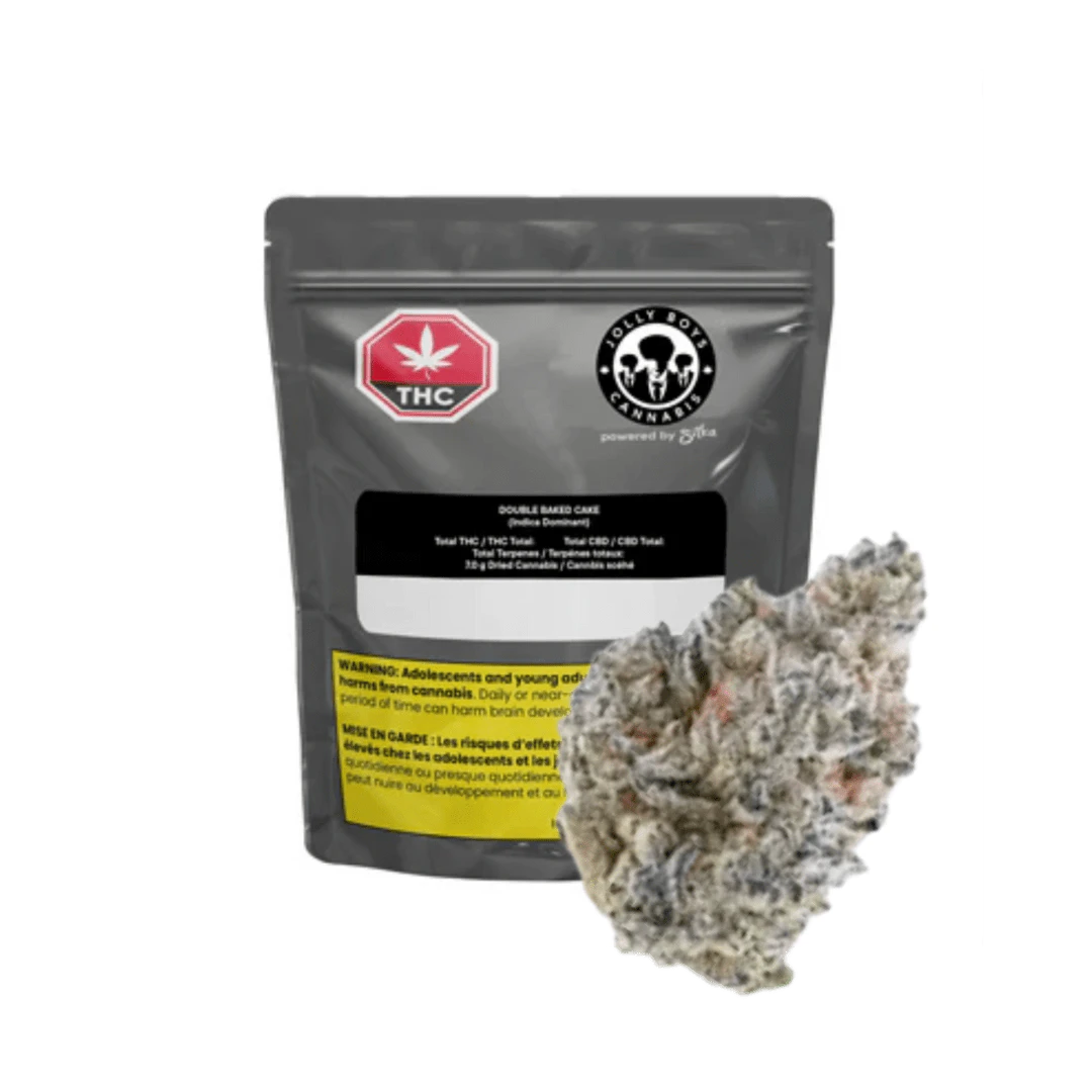 The Jolly Boys have arrived and are stoked to launch their Double Baked Cake! A tantalizing indica-dominant cultivar that delivers the ultimate Dessert experience, Double Baked Cake is the perfect blend of indulgent Cake and Cookie flavour profiles. This exquisite cultivar offers a rich symphony of sweet, creamy vanilla cake layered with buttery cookie dough undertones, all tied together with a whisper of spice. Terpenes include caryophyllene, limonene, and myrcene.