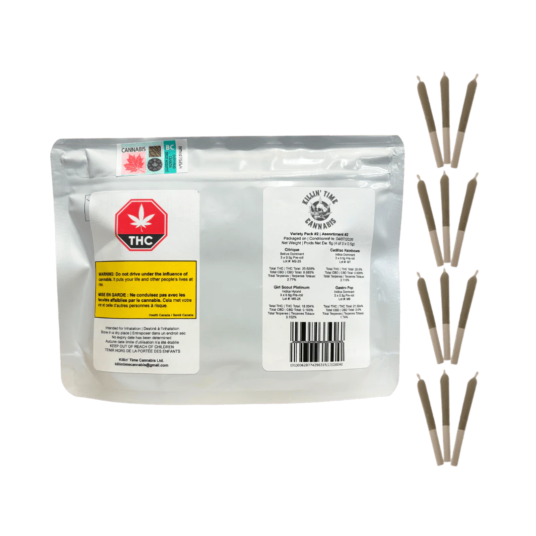 Killin' Time Cannabis Pre-Roll Variety Pack is built to support rotation and comparison across multiple cultivars. The packs are designed for those who want to experience different terpene and effect profiles without committing to a larger quantity of a single strain.