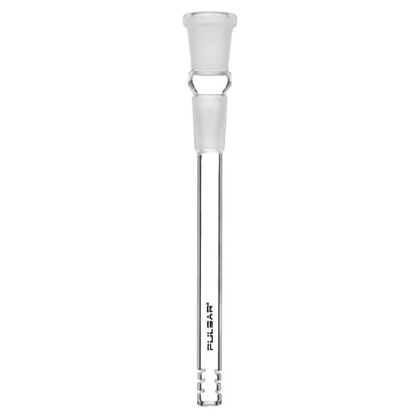 The glass on glass diffused downstem features 6 slits, a 14mm ground joint, and a 14mm slide joint. -The length from the bottom of the ground joint to the diffused bottom is 4". The length from the top of the ground joint to the diffused bottom is 4.95" . The complete downstem length is 6.5". These downstems accommodates a 14mm herb bowl or banger.